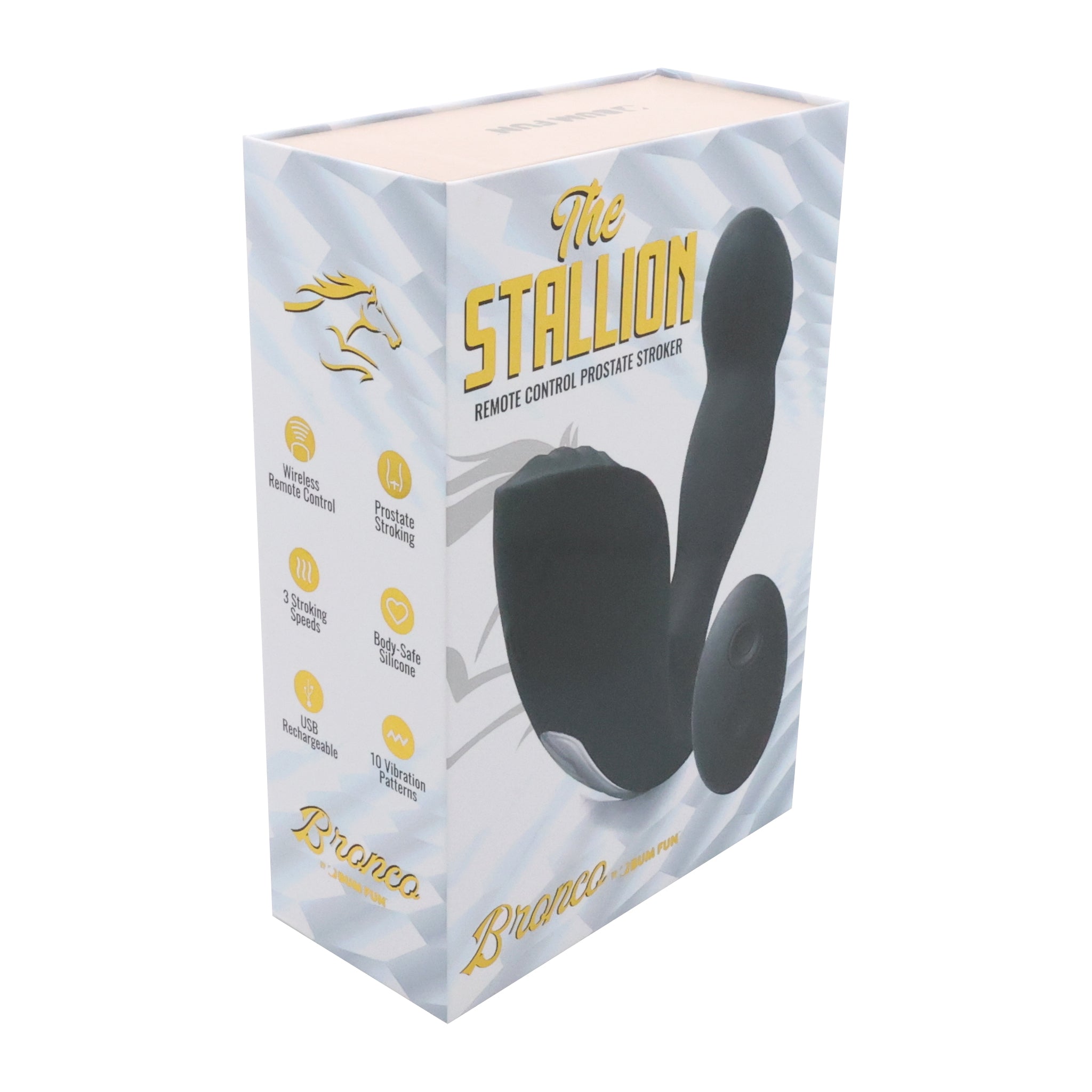 Intensify your pleasure with the Stallion prostate massager by Bronco! This stroking and vibrating prostate massager includes a wireless remote that lets you control the 10 vibration patterns and 3 stroking speeds. The specially designed plug curves forward for targeted P-spot stimulation, while the perineal stimulator is extra-wide and textured for that much-desired pressure. So send your arousal over the edge with the Stallion prostate-stroking vibe!