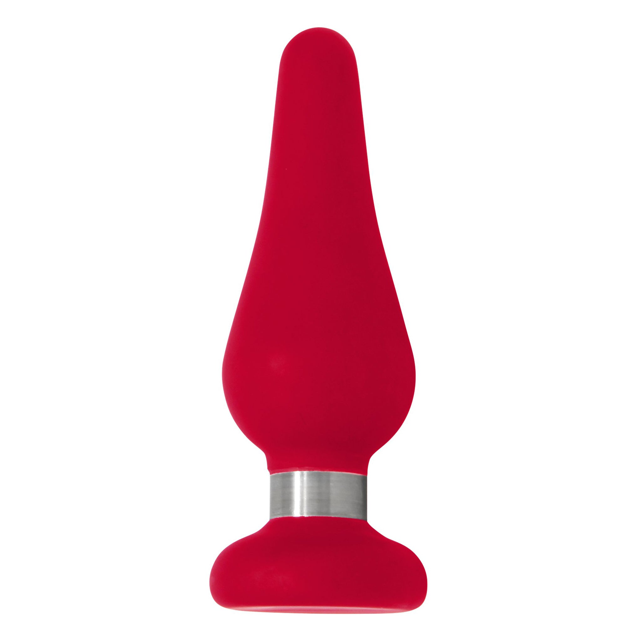 Welcome your new favorite Gamma mid-size silicone anal plug by Bum Fun! The exaggerated teardrop shape features a tapered tip for easy entry, plus an elegant metallic band around the narrow neck. Get the Beta small and the Delta large plugs to complete the set!