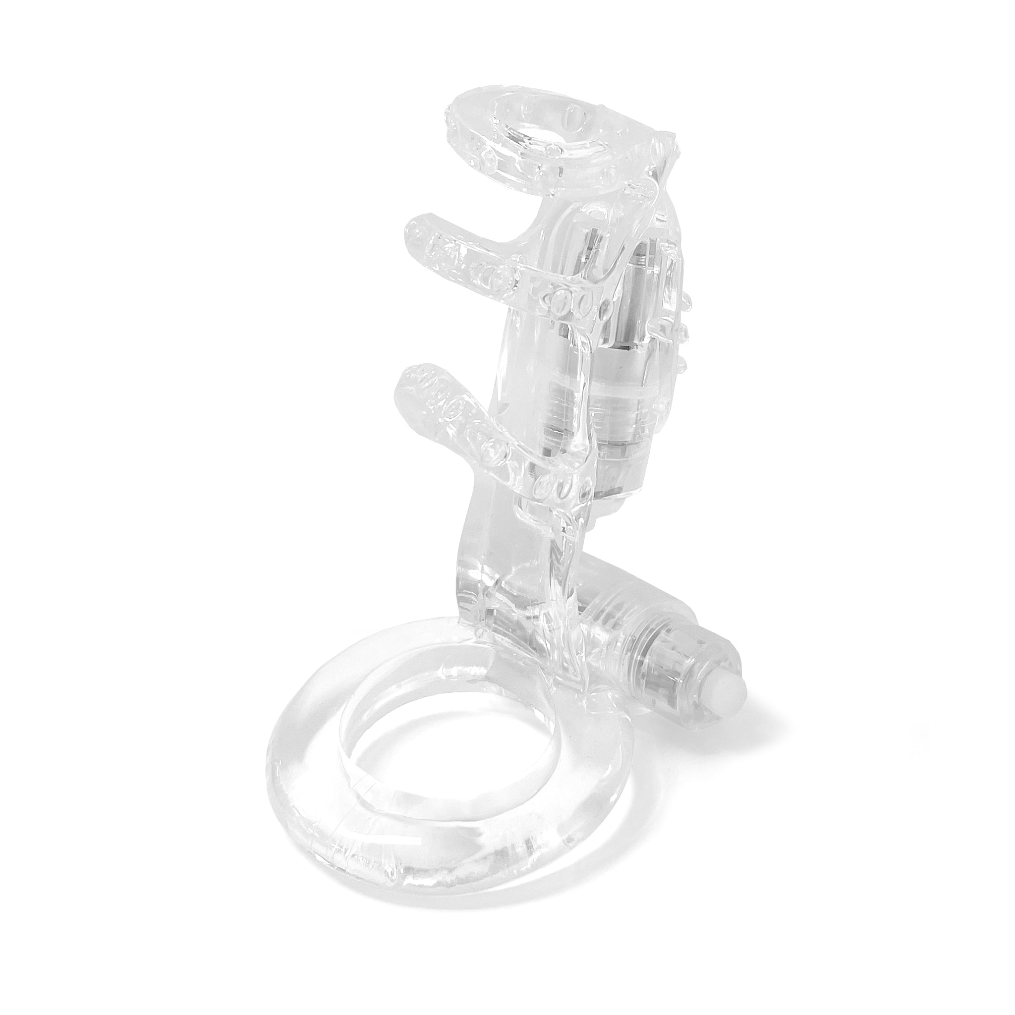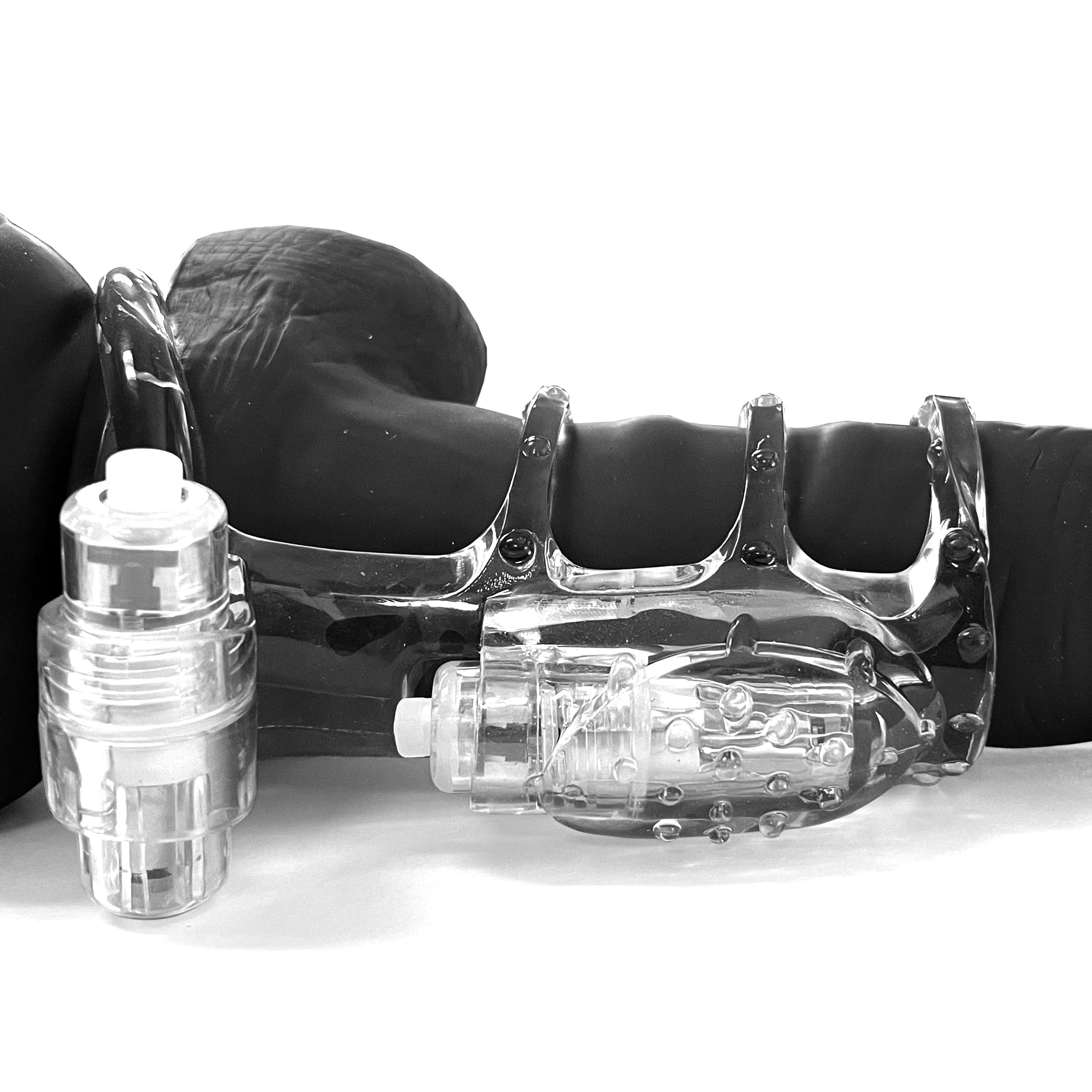 Upgrade you and your partner's pleasure with this dual-vibrating cock cage! The stretchy retention straps fit over your penis and scrotum for a longer lasting, harder erection. Restricting blood flow helps to boost your stamina, while providing her with orgasmic vibrating waves . Remove the bullet for more creative fun to help heighten the mood.