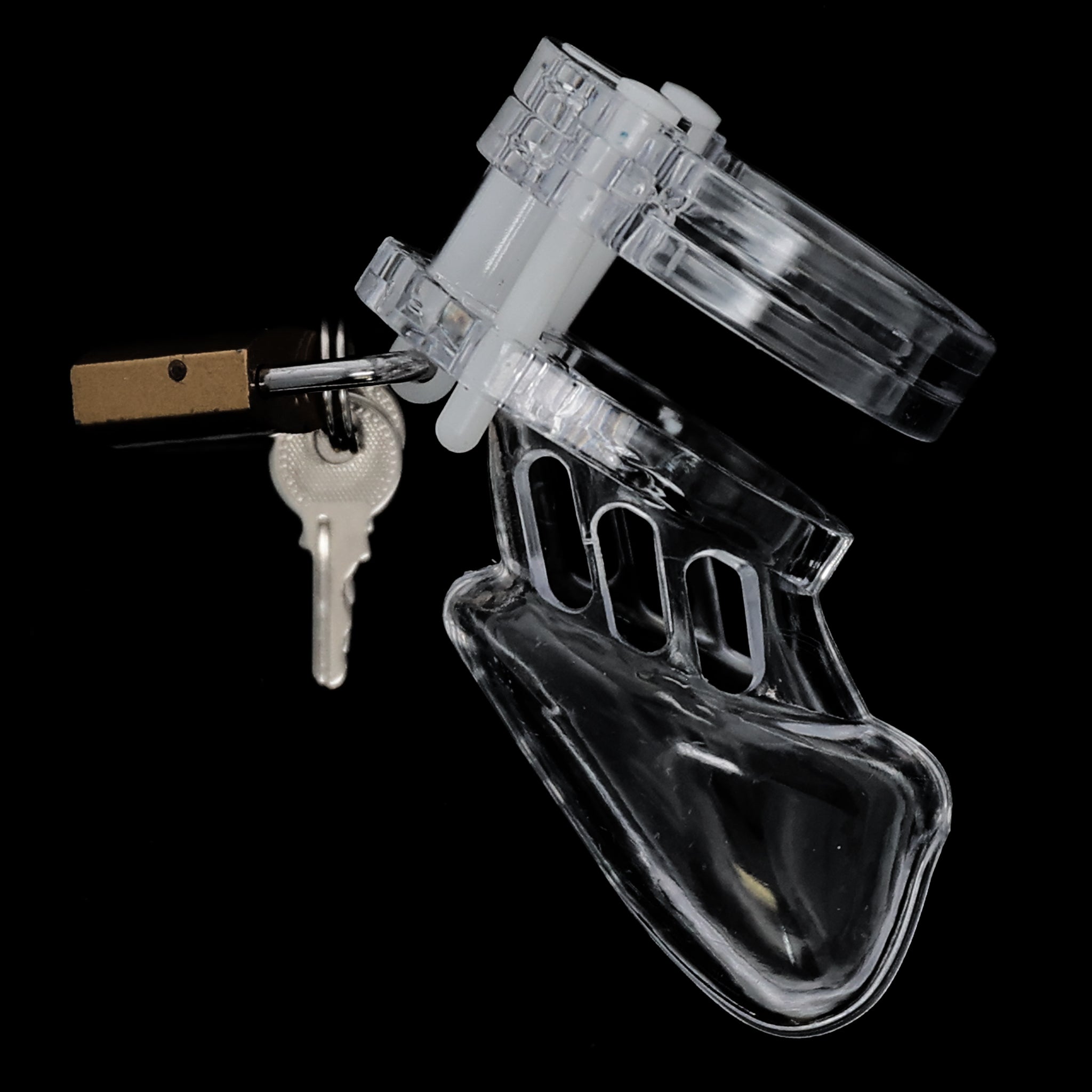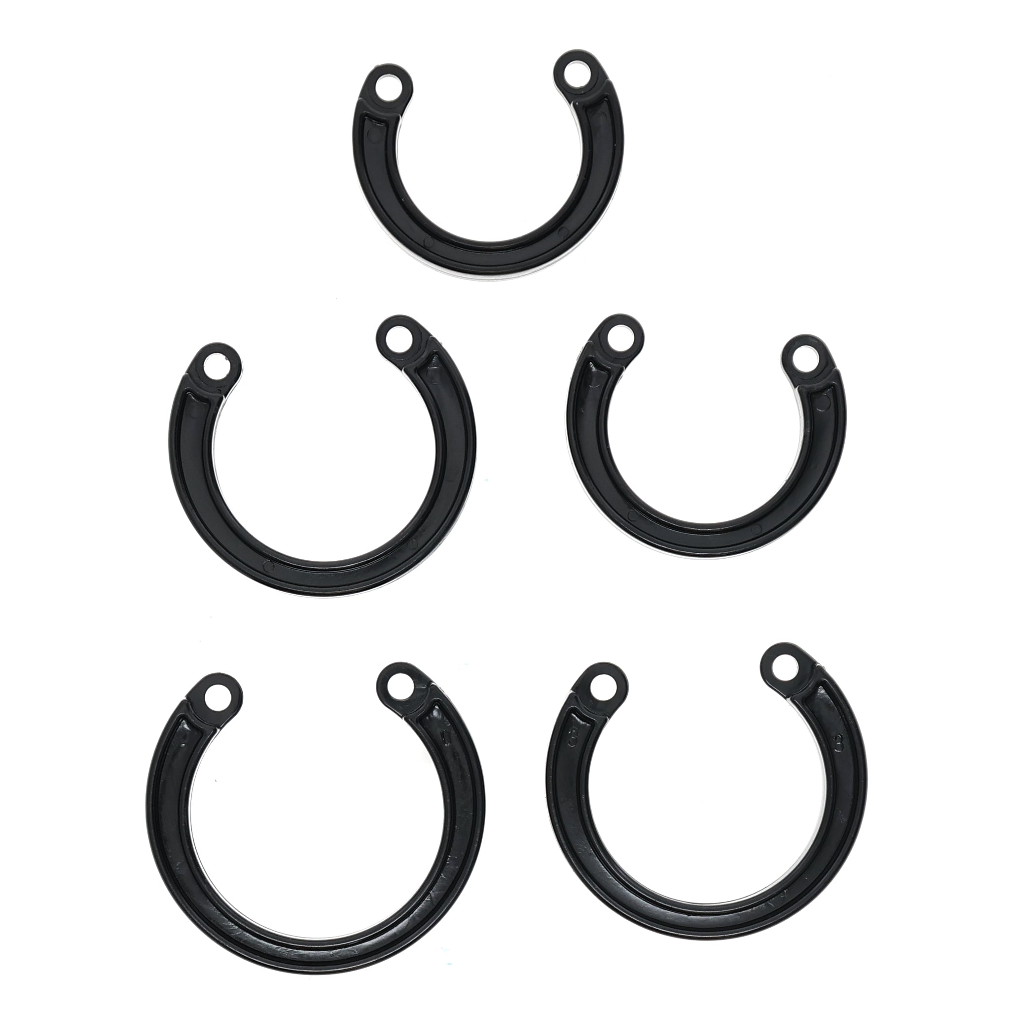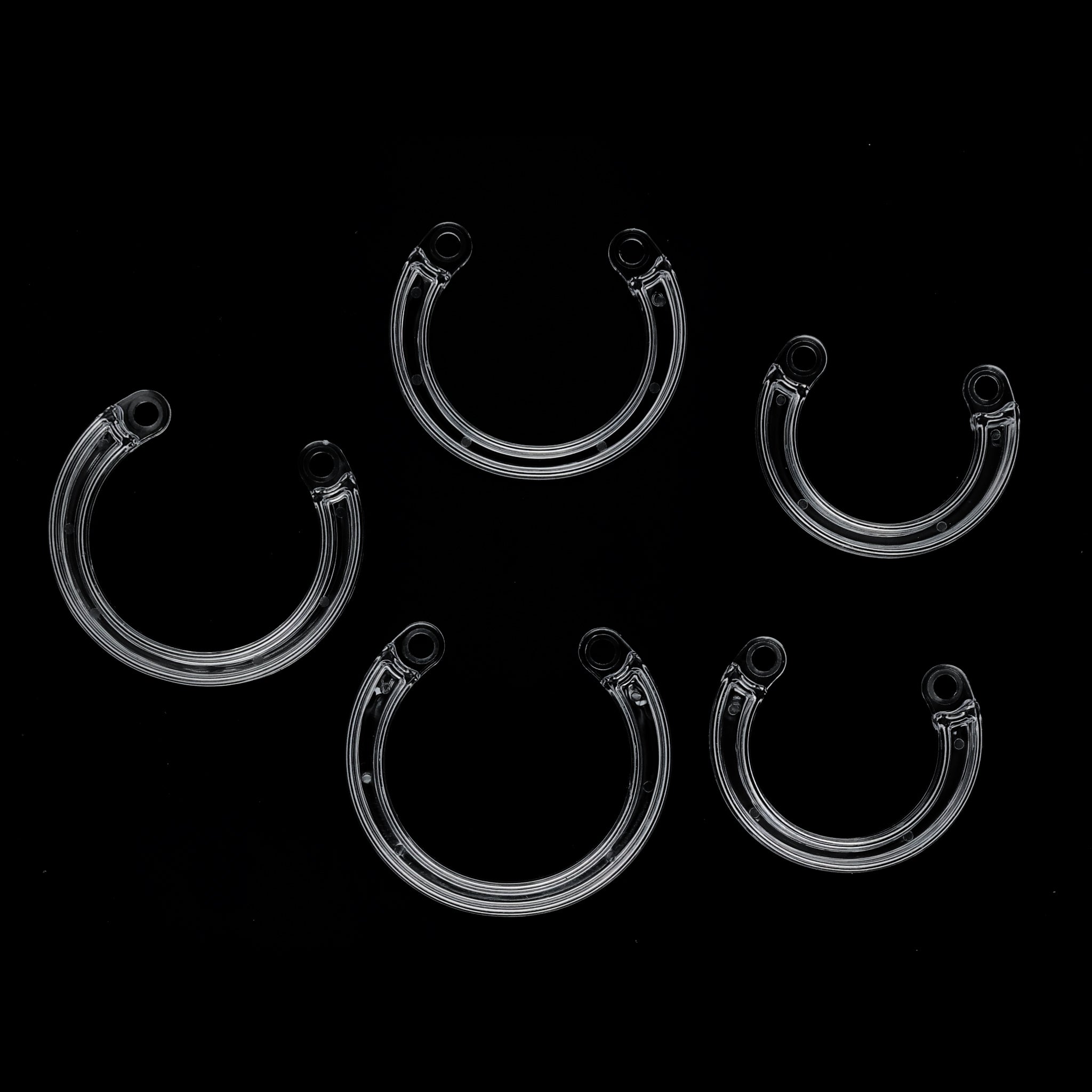 This cock cage set includes five rings in sizes 35mm, 38mm, 43mm, 46mm, and 49mm, allowing for a customized and secure fit. Designed for comfort and durability, it offers versatility to accommodate different preferences and ensures effective restraint. Ideal for those seeking precise control and enhanced experience.