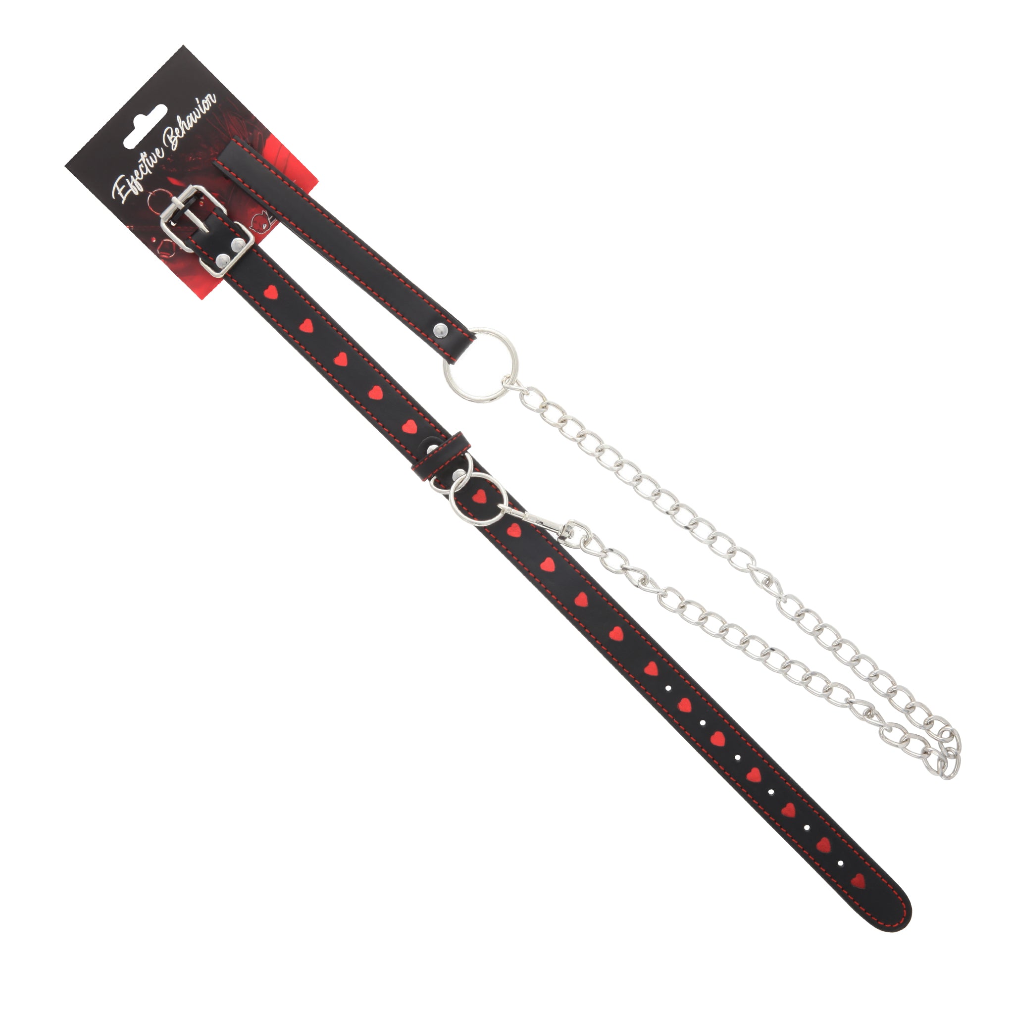 You'll fall in love with this heart collar and leash set. 53X delivers this genuine leather bondage collar for your kinky pleasure! The thin band features little red hearts and a solid loop ring hanging in the front. The buckle strap is adjustable to fit almost any wearer. Attach your own personal charm, or use the included leash to intensify your thrilling bondage play!