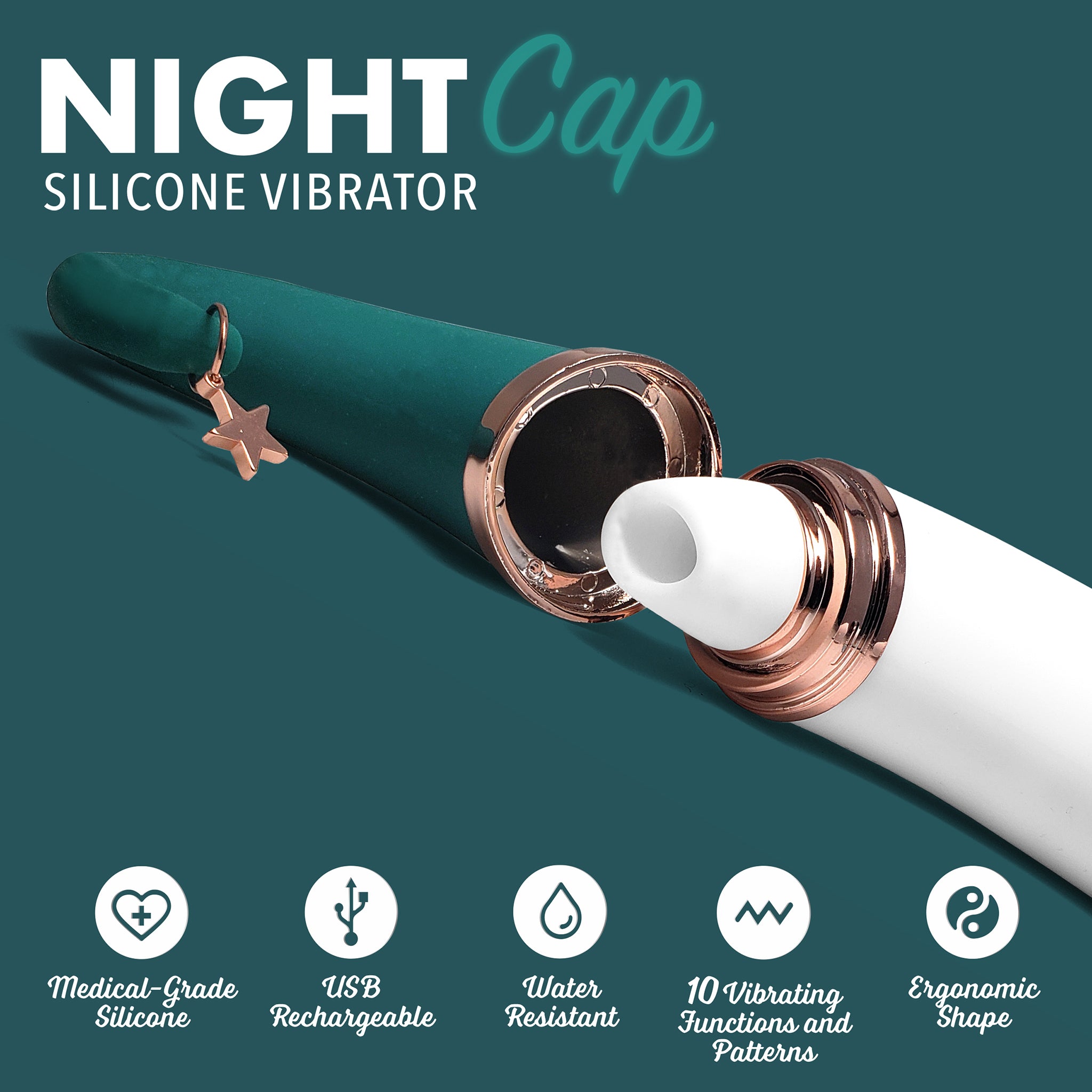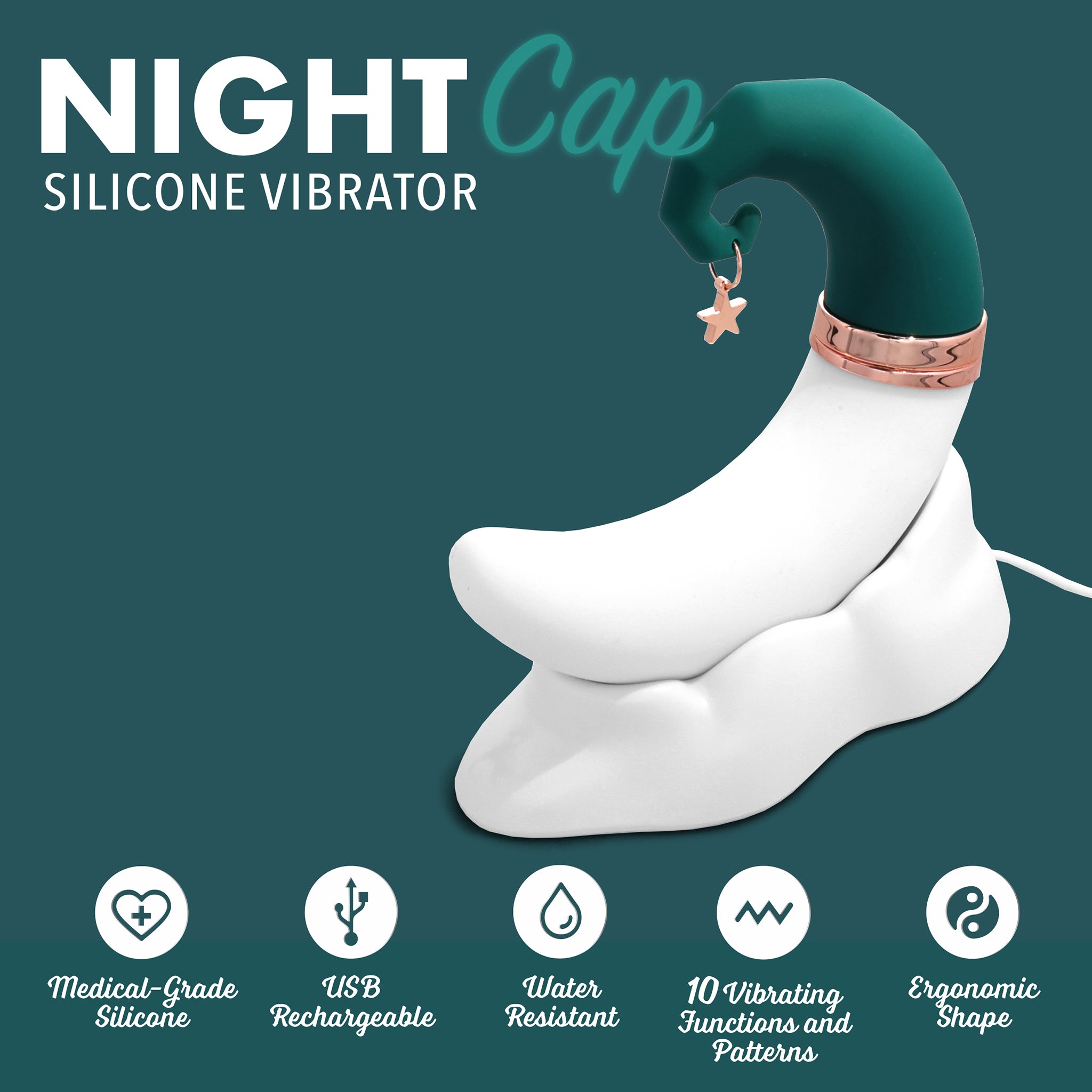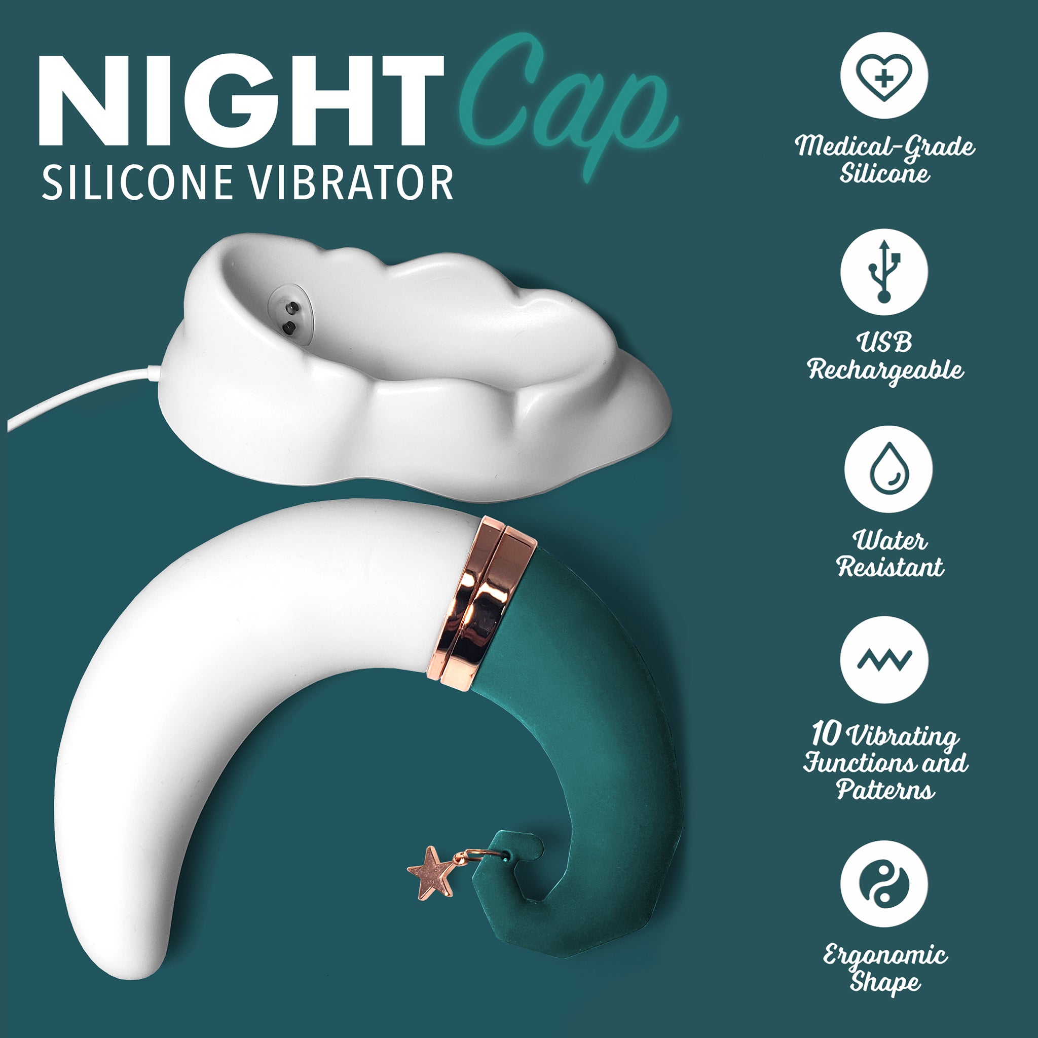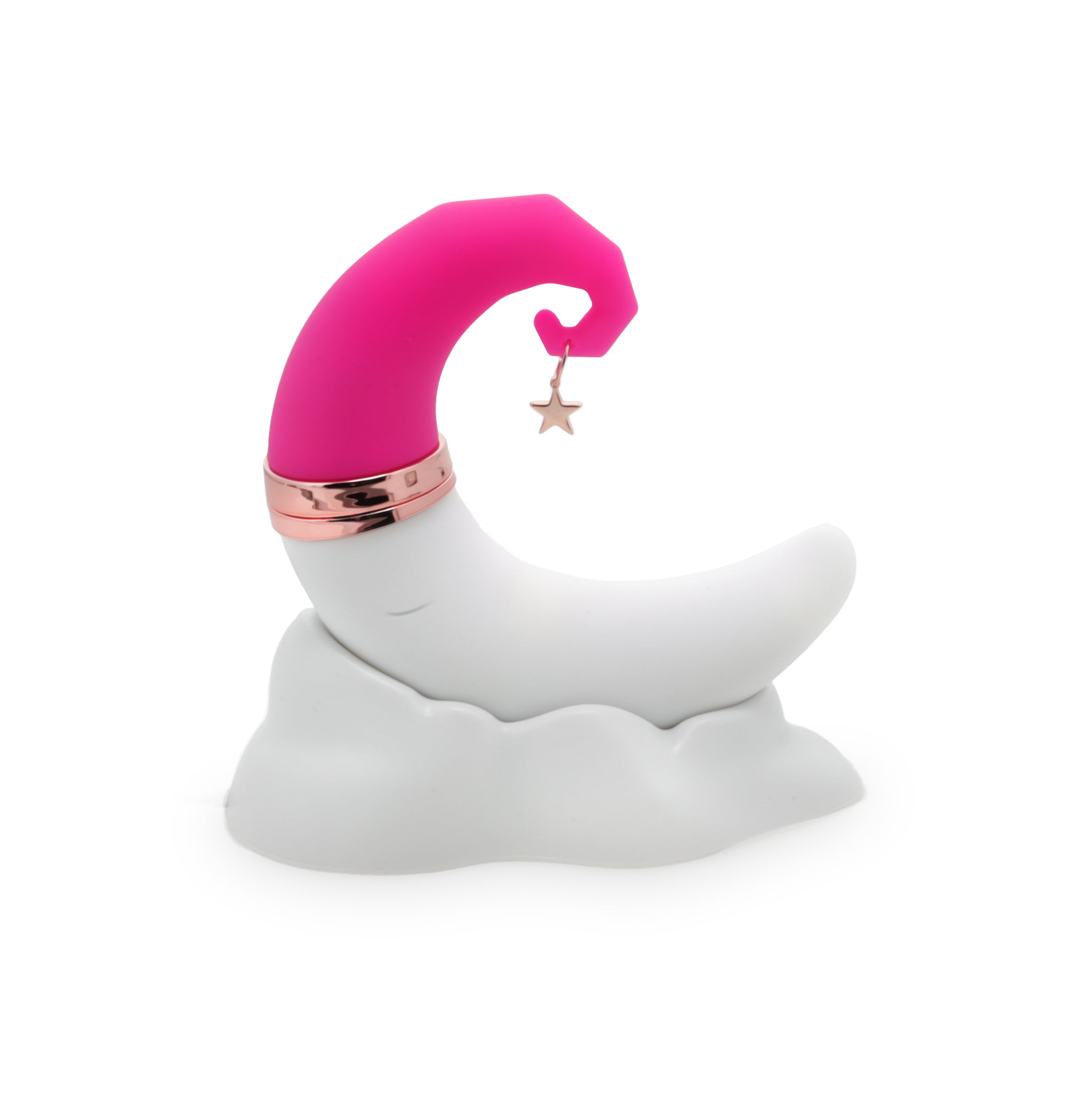 This crescent moon shaped silicone pulsating vibrator is adorable and comfortable to hold. Created to provide unbelievable clitoral stimulation beyond your wildest dreams with 10 different vibrating and 10 different pulsation settings. The magic is the unique crescent moon shape making handling comfortable as well as the impressive power settings. This clitoral excitement will have you seeing stars! The NightCap is easy to use with two separate buttons that individually control the vibration patterns and the pulsating action. The NightCap comes with a convenient cloud charging doc to make recharging a breeze!