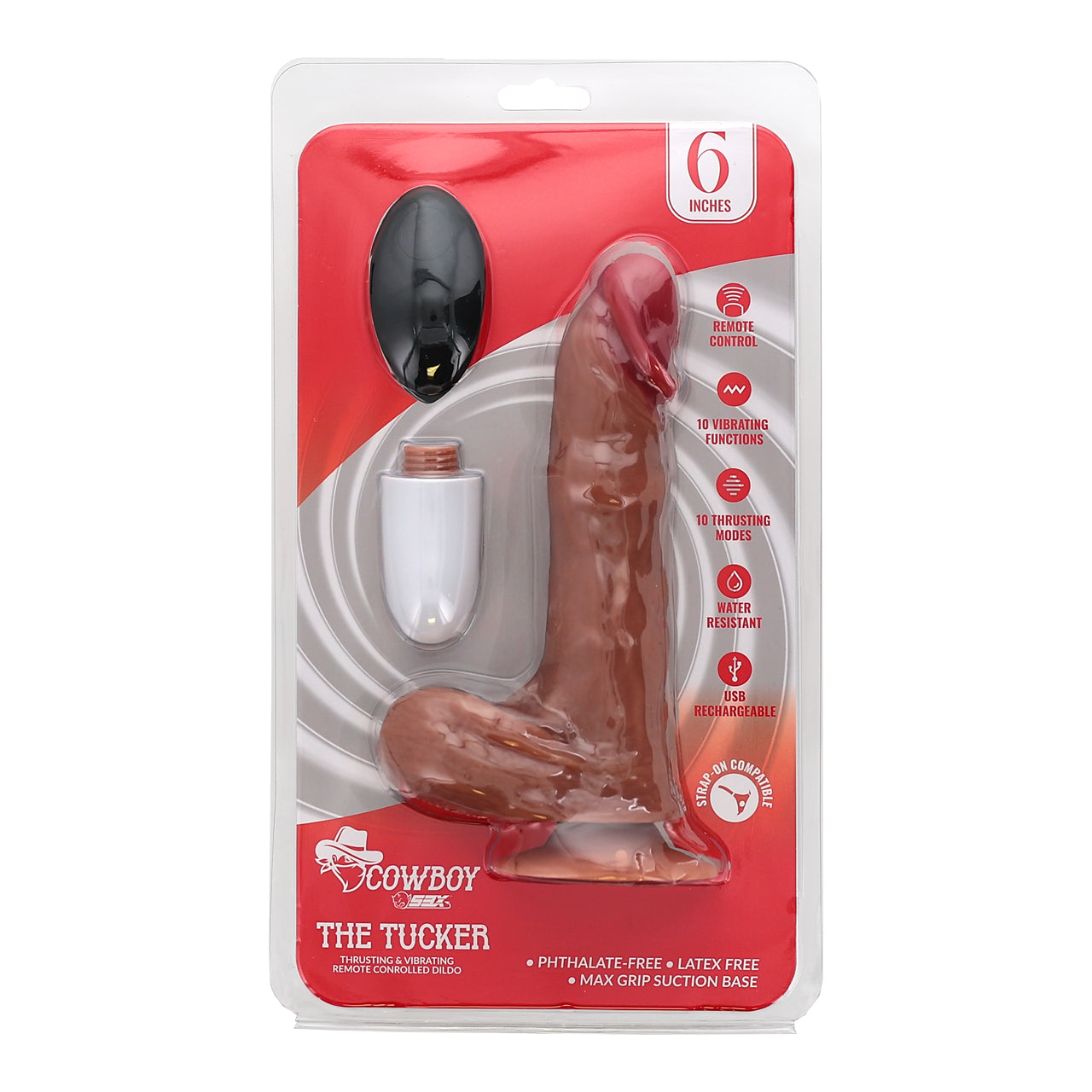 Introducing The Tucker, a vibrating & ejaculation remote controlled dildo. Multi-Point Stimulation: You don't need tocaress your clitoris with your hand anymore as you can now enjoy the majical thrusting of the Tucker. Free your handscompletely, it takes care of every orgasm for you. Thrusting & Waving Function includes 10 frequency modes and cyclicswitching. Feel the Thrill. The Tucker’s’s robust shaft is soft yet firm, ready to explode into action. Indulge in the momentwith this masterpiece of pleasure!
